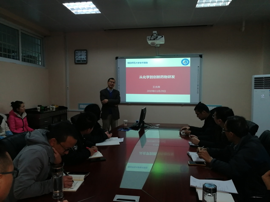 11月29日,应crown皇冠体育平台邀请,复旦大学王永辉教授来crown皇冠体育平台进行学术交流,在化学楼学术报告厅作了题为“从化学到创新药物研发”的学术报告,报告会由crown皇冠体育平台唐林博士主持,crown皇冠体育平台有机化学相关方向的青年教师和研究生参加了此次报告会。
