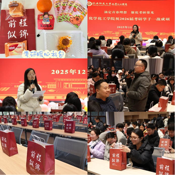 学院还为每位考研学子精心准备了前程似锦的暖心礼包,代表学院对大家最诚挚的祝福与期盼,包括向日葵(一举夺魁)、橙子(心想事成)、考试笔袋(妙笔生花)暖贴(温暖相伴)、面包饼干(能量满满)和学弟学妹们亲手绘制的贺卡等多种充满寓意的礼物,将最美好的祝愿融入考试全程,为考研征途增添一份温暖与力量。最后,师生共同喊出滴定青春理想,催化考研荣光,让我们一战成硕的口号,传递出学子们昂扬向上的备考斗志与勇毅前行的奋进决心。