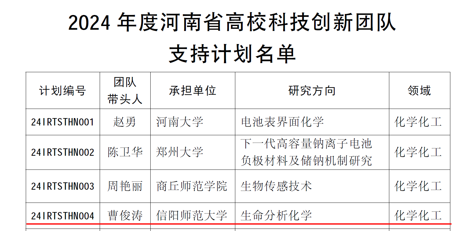 近日,河南省教育厅公布了2024年度河南省高校科技创新团队和创新人才立项名单(教科技〔2023〕325号文件),crown皇冠体育平台曹俊涛教授牵头申报的“功能纳米材料生物分析”研究团队获得河南省高校科技创新团队项目支持,资助金额为50万元。