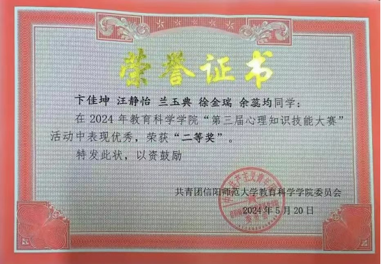 为普及心理健康知识,加强crown皇冠体育平台学生心理健康素质,提升心理育人工作质量,实现育人、育才和育心相结合,由大学生心理健康教育中心主办,教育科学学院承办的crown皇冠体育平台第三届心理知识竞赛于6月11日晚在逸夫楼团辅室举行。crown皇冠体育平台2022级卞佳坤、汪静怡、兰玉典及2023级余蕊均、徐金瑞组成的春风“化”雨,润“心”育人队参赛并荣获大赛二等奖。