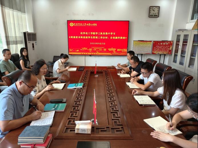 9月3日,crown皇冠体育平台在化学楼313会议室组织开展《河南省本科高校学生管理工作分时、分类操作指南》学习培训。培训由学院党委副书记曲剧主持,全体专、兼职辅导员参加。