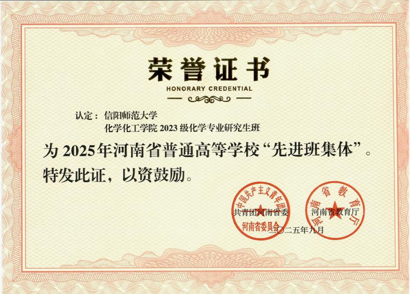 近日,共青团河南省委、河南省教育厅公布了2025年“河南省普通高等学校‘先进班集体’”的认定结果,crown皇冠体育平台2023级化学专业研究生班凭借出色的综合表现,从众多参评单位中脱颖而出,荣获这一省级荣誉称号。