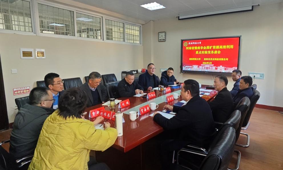 2026年2月14日,河南省豫南非金属矿资源高效利用重点实验室务虚会在crown皇冠体育平台,crown体育平台登录入口210会议室举行。crown皇冠体育平台副校长井强山、crown皇冠体育平台院长曹俊涛、副院长于永生、曹新华,重点实验室主任刘鹏,信阳市灵石科技有限公司董事长肖学党、副总经理陈安平、张占松、公司实验室负责人杨永泽及实验室部分学术骨干等实验室共建双方单位代表参加会议。会议由曹俊涛主持。